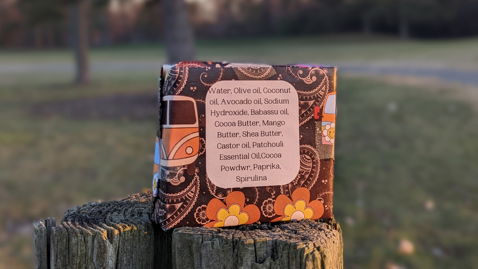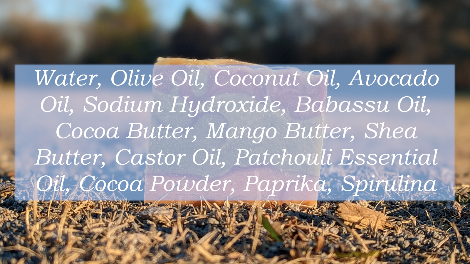 Water, Olive Oil, Coconut Oil, Avocado Oil, Sodium Hydroxide, Babassu Oil, Cocoa Butter, Mango Butter, Shea Butter, Castor Oil, Patchouli Essential Oil, Cocoa Powder, Paprika, Spirulina