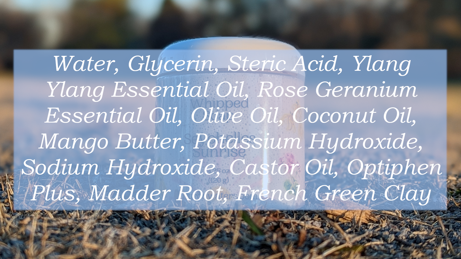 Water, Glycerin, Stearic Acid, Ylang Ylang Essential Oil, Rose Geranium Essential Oil, Olive Oil, Coconut Oil, Mango Butter, Potassium Hydroxide, Sodium Hydroxide, Castor Oil, Optiphen Plus, Madder Root, French Green Clay